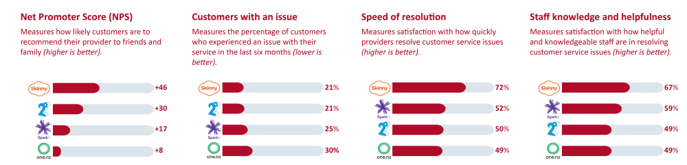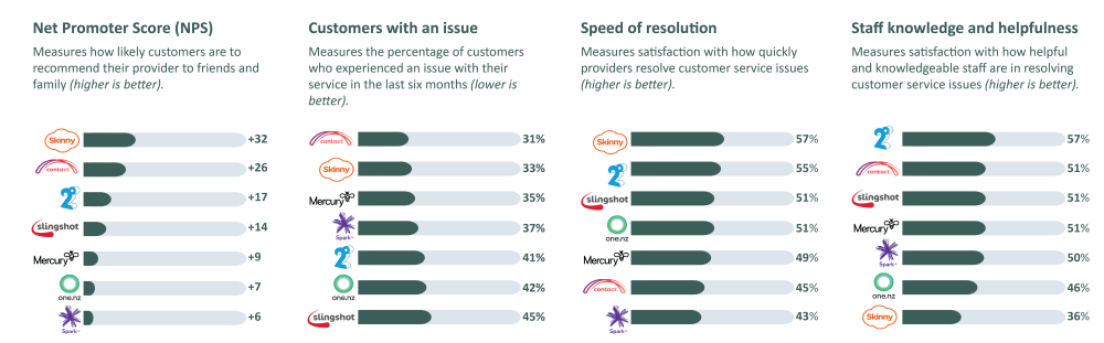 Contact Energy outperforms traditional telcos in broadband satisfaction and staff helpfulness, while One NZ (formerly Vodafone NZ) ranks low in most categories, except for the speed of resolving broadband issues.